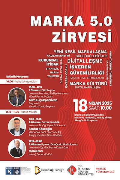 Branding Türkiye ve İstanbul Kültür Üniversitesi Meslek Yüksekokulu organizasyonuyla gerçekleştirilecek olan “Dijitalleşme, Sürdürülebilirlik ve İşveren Odağında Markalaşma” ana temalı Marka 5.0 Zirvesi (2025) için geri sayım başladı! 18 Nisan 2025 tarihindeki zirvede öncü markaların c-level yöneticileri bilgi ve deneyim aktarımında bulunacak!
